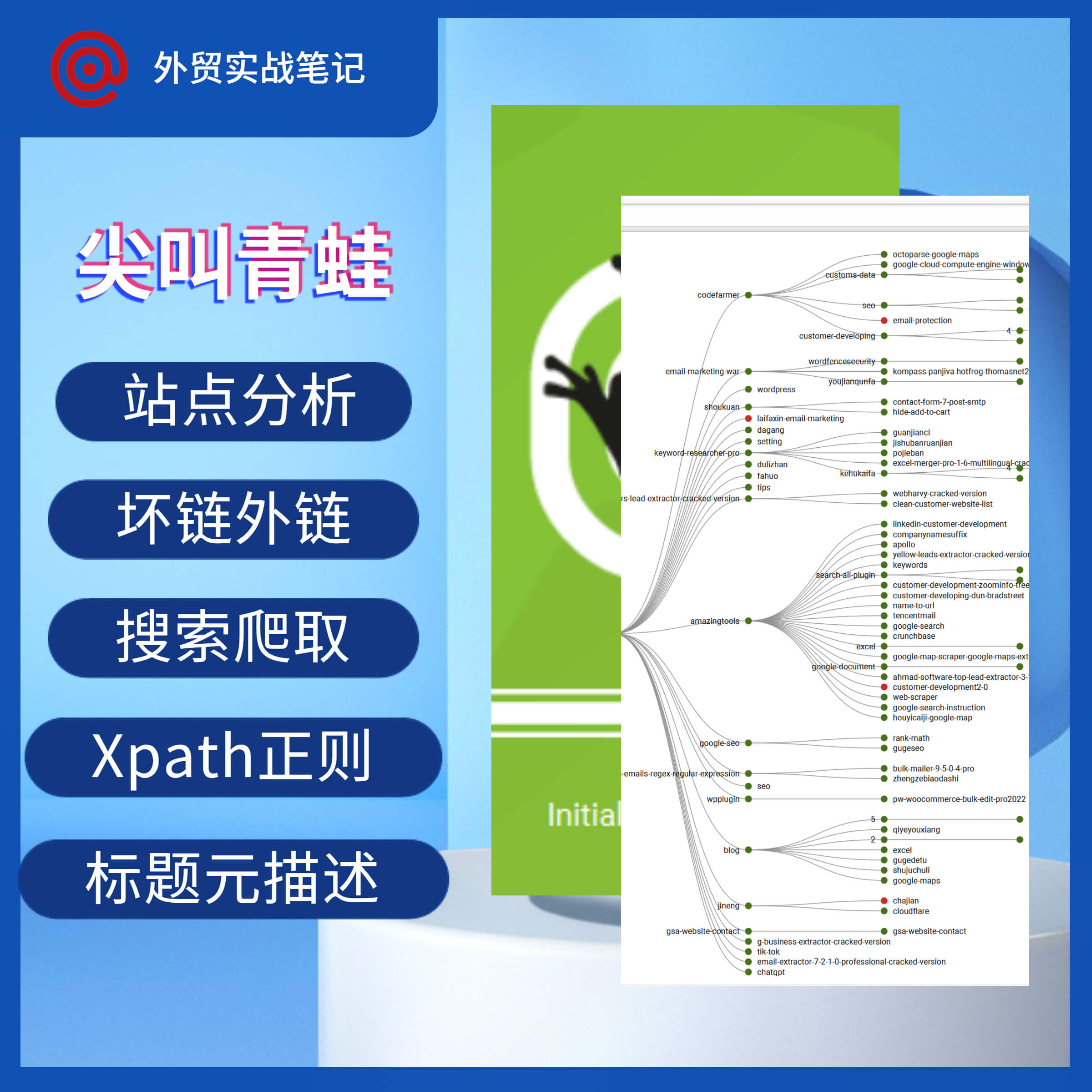 Screaming Frog 尖叫青蛙,站点分析,结构图,坏链外链,标题,元描述,搜索、爬取,Xpath,CSSPath,正则,SEO专业工具,竞争对手全面分析,可视化,技术版,外贸实战笔记。